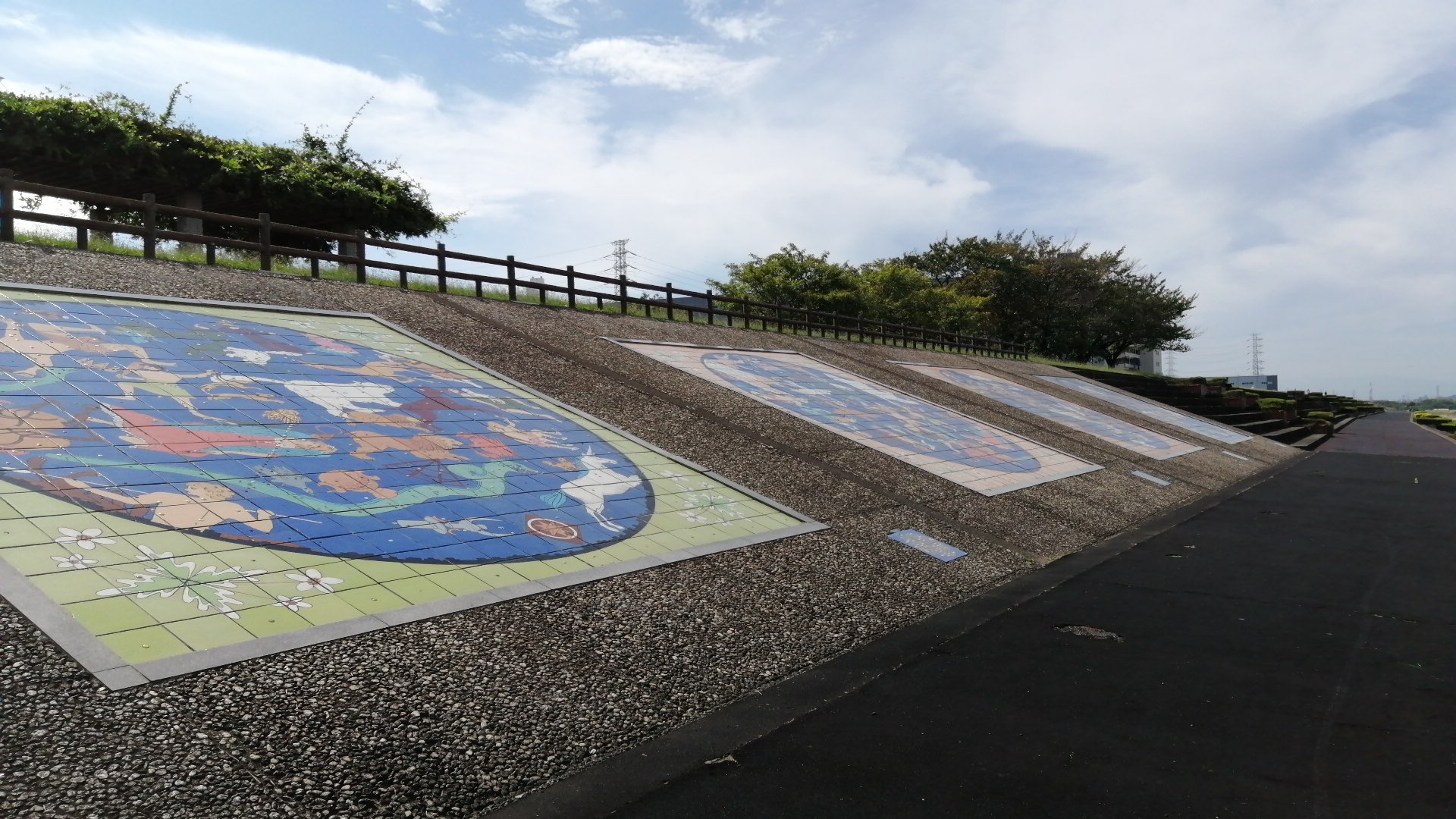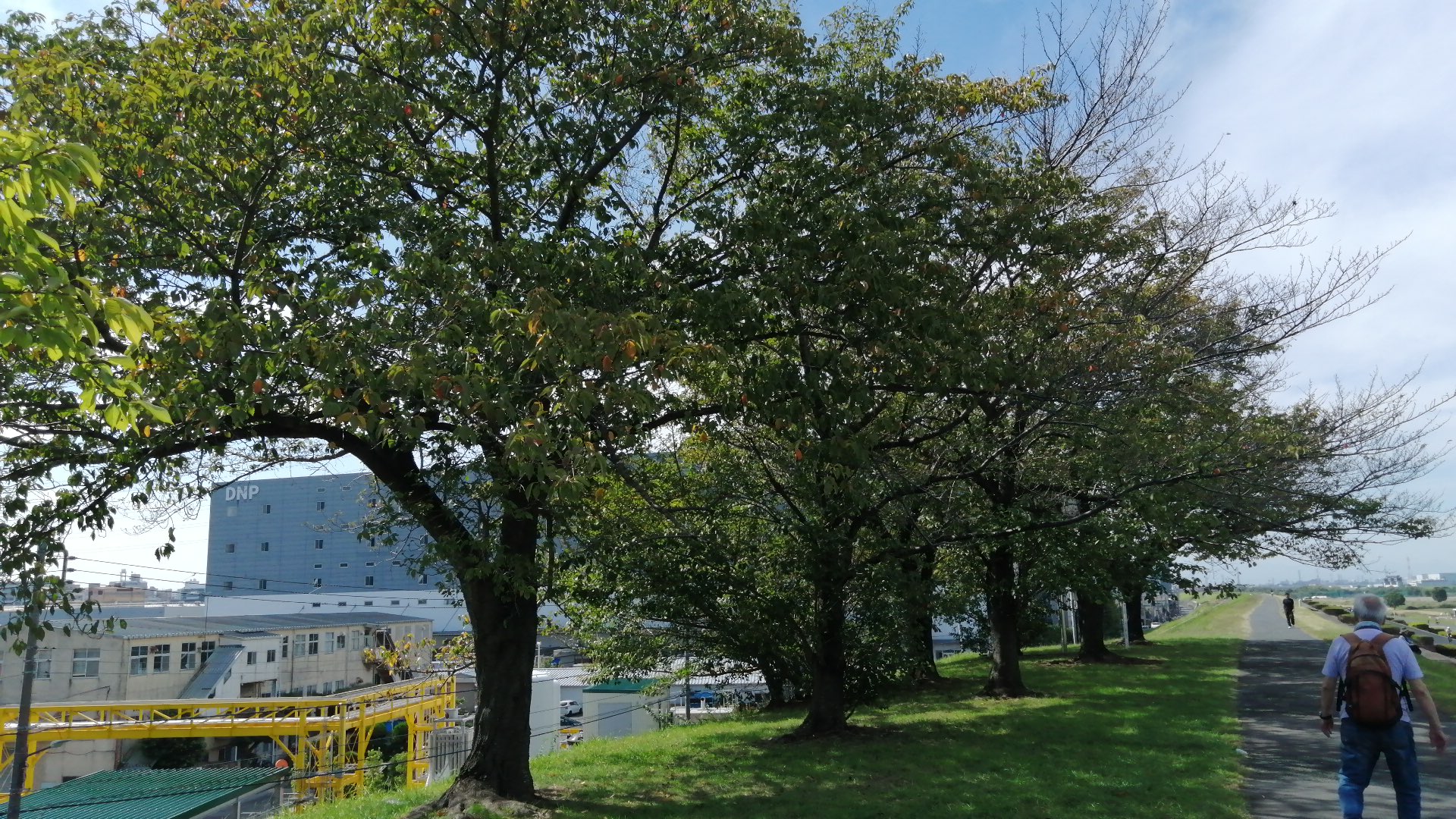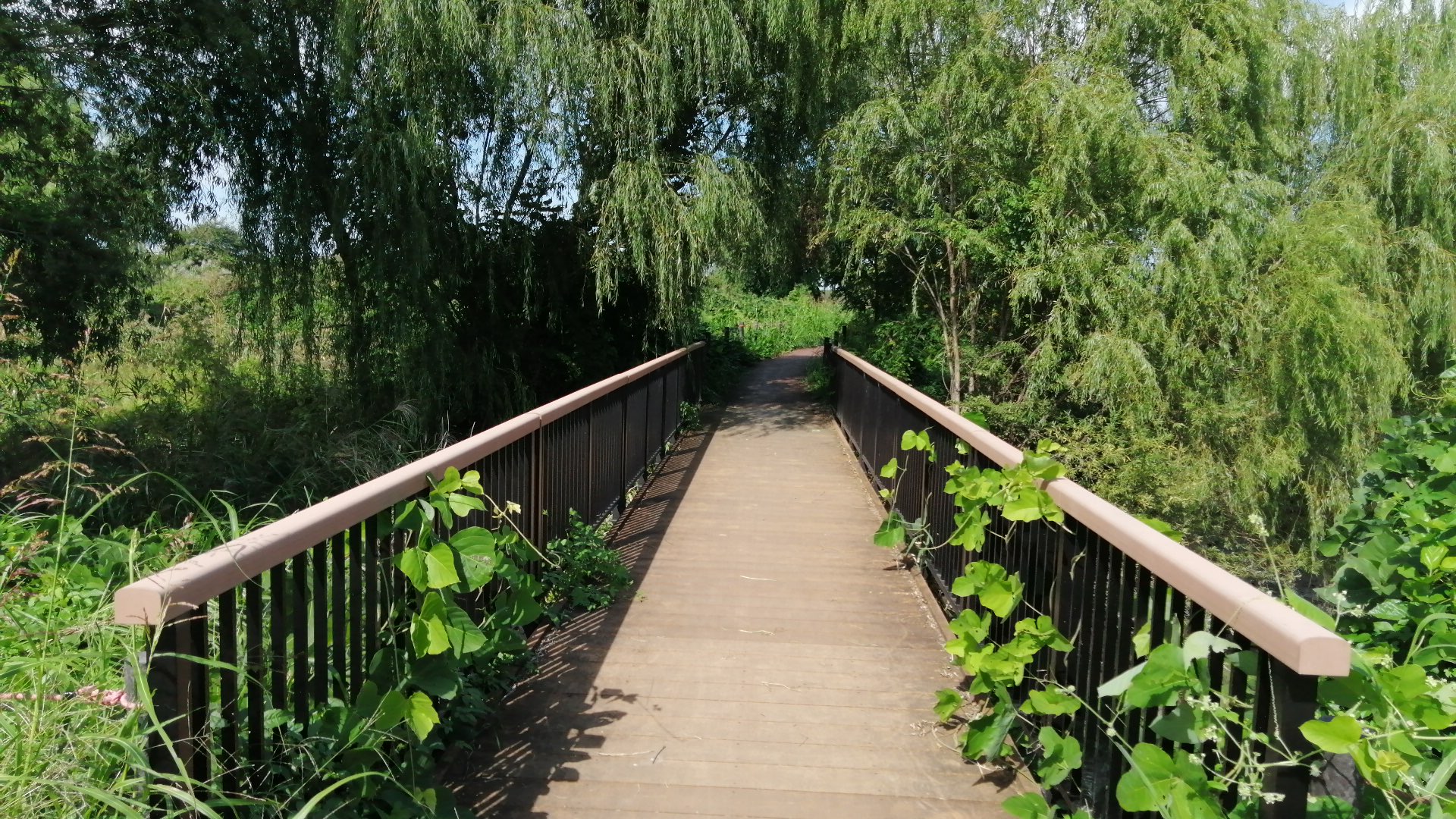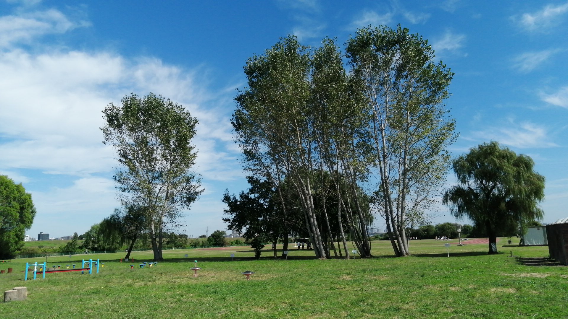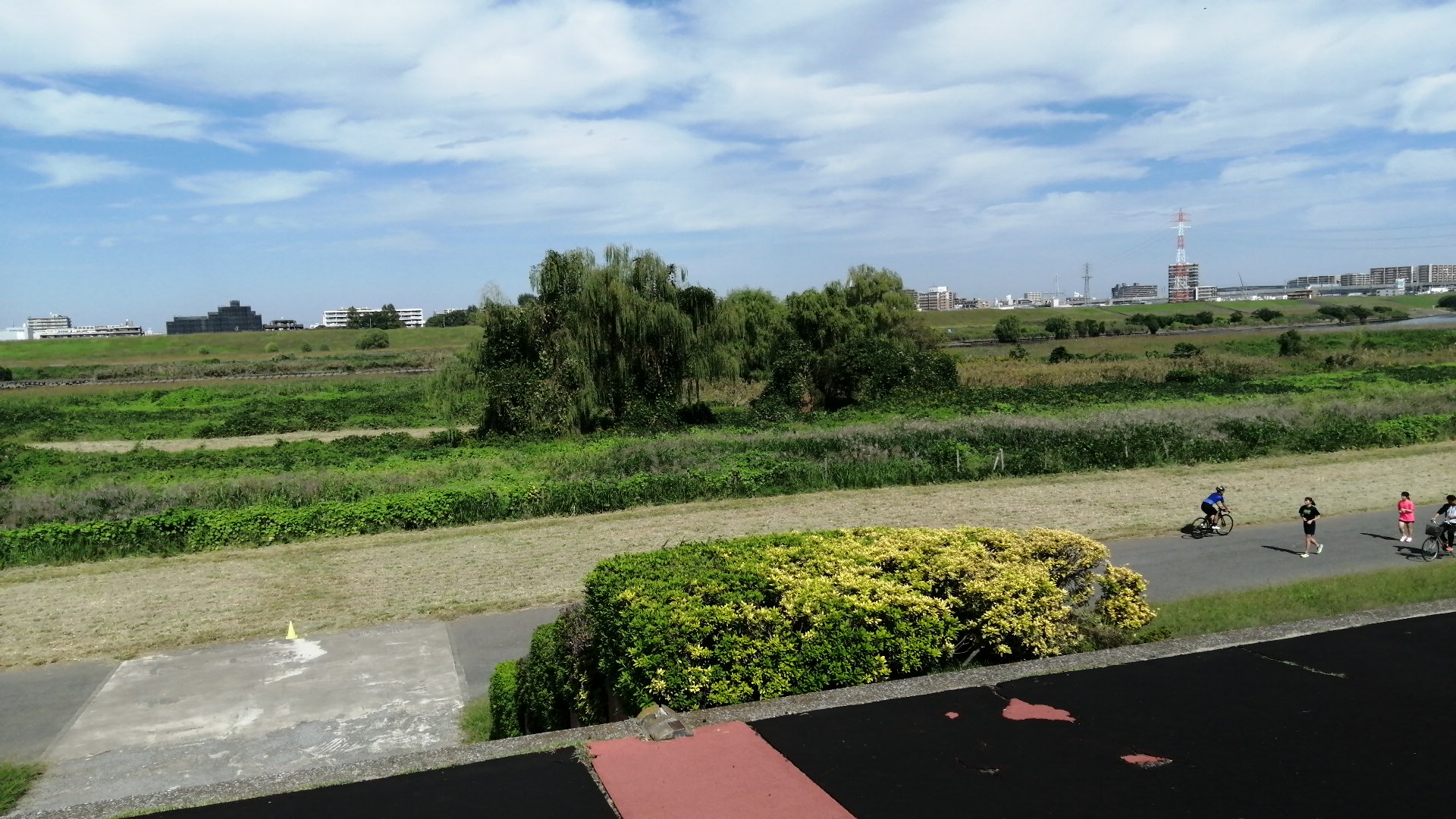 遠くを川が流れ、近くはスポーツグラウンド、ずっと先に橋