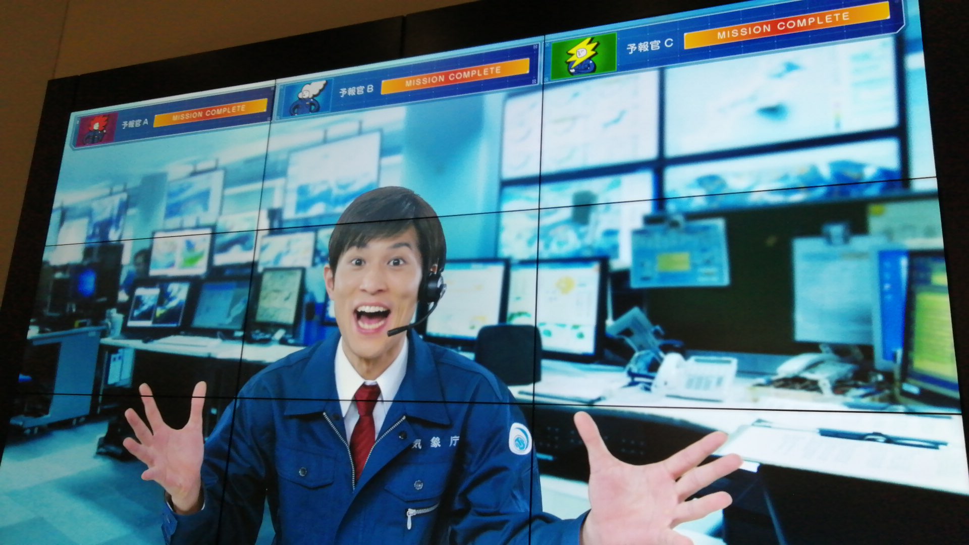 大画面に映るお兄さんが3人の隊員にクイズを出していく