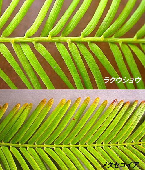 左右の葉っぱが同じところから出ているのがメタセコイアで