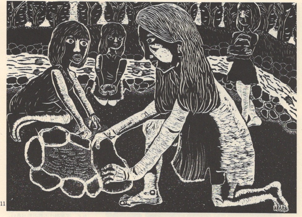 「版画集を手にした時、正直いって、脳天に火花が発するほどに、強いショックを受けました。専門家がいくら細かい研究を重ね、いろいろとむづかしい理屈をこねてみても、なかなかつかめないものを、この小学生たちはしっかりと自分の中で探り当てたのではないか、と」